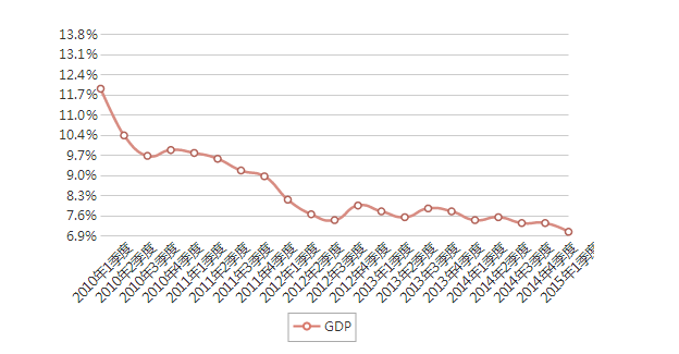 中國一季度國內(nèi)生產(chǎn)總值140667億元,同比7%,增速創(chuàng)2009年以來6年新低。2014年來各季度GDP增長率分別為:7.4%、7.5%、7.3% 、7.3%,今年GDP增長目標(biāo)為7%左右。